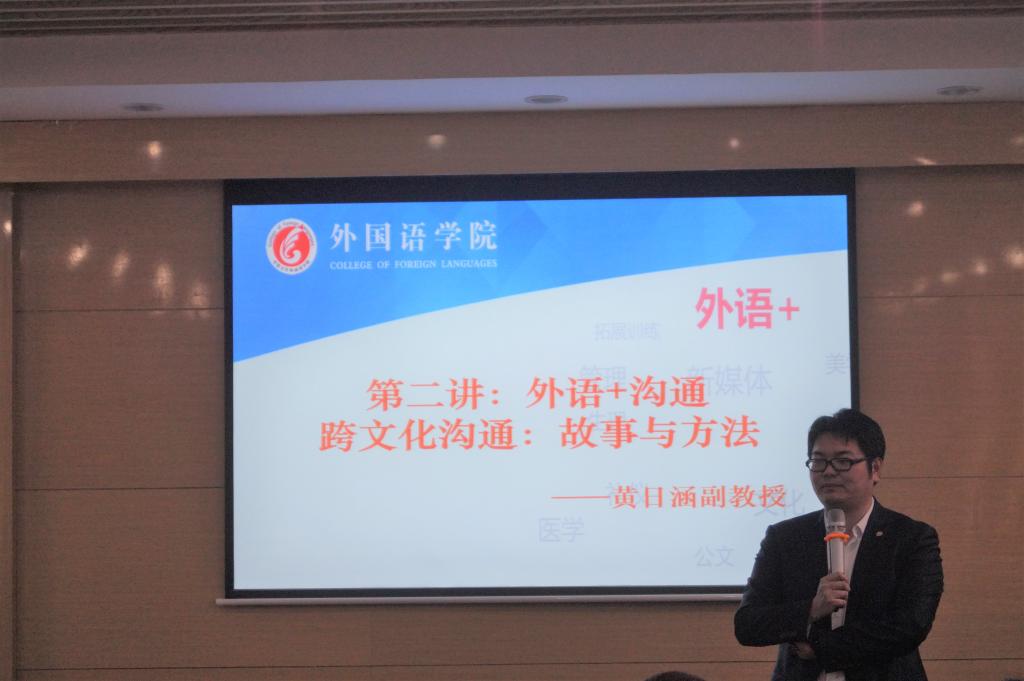随后,黄教授以“外语+沟通——跨文化沟通的故事与方法”为主题开启了美妙而精彩的新知之旅。黄教授提到“沟通是无尽的想象”,强调了在跨文化环境下良好沟通的重要性,并通过自身实践和经历为同学们绘声绘色地讲述了自己跨文化交流的相关趣事,课堂气氛活跃轻松。此外,黄教授讲述了认知和宗教在跨文化交流中的重大意义,指出在跨文化交流中,一定要充分理解对方的文化背景,了解对方的需求,从而在互信的基础上实现合作。课后,黄老师与同学们进行了深入浅出的交流,课堂氛围非常活跃。
