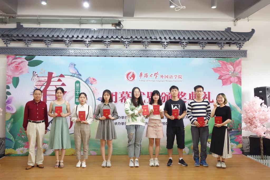 颁奖开始前,现场展示了本届春之声部分获奖赛事作品。由来自信息学院的钟宇涓、外语学院彭璐怡、毕云笛尹智贤等同学为我们分别展示了英语演讲、日语演讲、英语影视配音、日语影视配音,展现了华园学子扎实的外语基础和勇于尝试、勇于拼搏、勇于挑战的精神风貌。