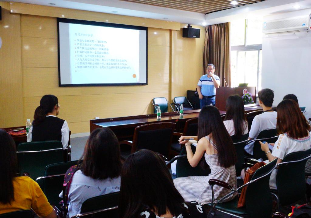 讲授过程中,朱润东老师风趣幽默、绘声绘色,充分调动起学员兴趣。他以大学校园的各个场景为例,形象地描绘出我们身边地世界经济环境和人文环境,以高度的人文关怀指出,世界经济地基础是人和文化。就当下的时政热点中美贸易战展开对人文对抗和人文包容的探究,他说到:“世界经济的走向和人文环境的走向是一致的”,我们不应该只是道听途说、盲目跟风,而应该去探究真相,这就需要我们大学生具备一定的人文情怀,培养明辨是非的思辨能力。“知识和能力是工具,是手段,是鱼;思想和偏好是策略,是目标,是“渔””。朱润东老师从自身对“鱼和渔”的理解出发,鼓励大家终身学习,但更重要的是要有策略和目标。无论是学语言还是学金融,都要克服“懒病”,并坚持下去。