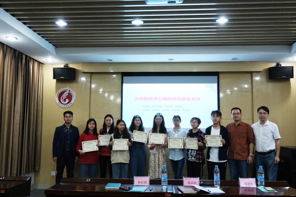 学院表彰了2018-2019学年获评优秀心理保健员的孙亿华、都尔斯娜、刘子煊、程温雅、吕颢轩、汪梦霞、王璐瑶、陈晨锋、李思薇等9名同学,并颁发了奖状证书。