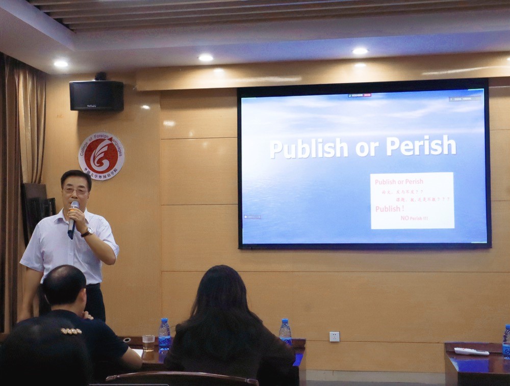 分享会伊始,卢教授用“Publish or Perish”拉开了本场讲座的序幕,并提出问题:论文,发与不发?课题,报,还是不报?针对这一问题,卢植教授给出了肯定的回答,即要积极发表论文,申报课题。紧接着,他就外语教师的教学科研与职业发展这一方面提出为什么要发表科研论文,表示发表科研论文不仅是单位学科建设和个人职业发展的需要,更是个人知识积累和能力的提升。与此同时,他提出,撰写和填报申报表需要学科素质、独到眼光、学术语言和专业素养,表示会通过课题申报动员、课题与教学换算、课题奖励、会议补助和论文评审推荐等方式来营造科研氛围,进而促进科研发展。随后,他就如何进行论文选题与精修分享了自己的经验,并强调外语教师应从日常教学实践中找到学术研究和论文写作的突破口,大家纷纷表示受益匪浅。讲座进入尾声,卢教授表示要以高端科研活动引领和反哺课堂教学,他引用了“Good teachers teach, great teachers inspire”这一名言来强调科研的重要性,并以“精诚所至,金石为开”为寄语鼓励在场的老师与莘莘学子。针对在场老师同学们的提问,卢教授也一一进行了细致解答与观点交流。