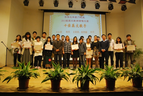 11月18日晚,2012yL23411永利集团厦门校区英文歌曲演唱大赛在王源兴国际会议中心G204成功落幕。 本次英文歌曲演唱大赛由永利23411集团大学英语部厦门校区2011级教研室主办,是厦门校区首次举行的英文歌唱类二课活动,以丰富学生的英语第二课堂活动、为学生提供展示英语技能和才能的舞台为目的。大赛邀请了大学英语部主任陈海蛟副教授、外籍教师Marilyn phillips、赵杏花老师和音乐舞蹈学院张毅琛老师和尼洪涛老师担任评委。大赛预赛采取视频参赛方式,共有来自厦门校区2011级6个学院的30组选手报名参赛,其中15组选手经过预赛评审进入决赛献出了精彩的现场表演。参赛歌曲风格多样,既有“Loving You”、“Angel”等深情优美的歌曲,也有"Larger Than Life"等激情四射的歌曲。整场大赛观众反响热烈,掌声、尖叫声不断。最终,建筑学院的王心童等十组选手荣获“十佳英文歌手”称号,信息学院的张国能等五组选手获得了“优秀英文歌手”称号。 此外,本次大赛的主持人由自愿报名并经过选拔后的2011级化工学院的林久人和白如冰同学担任。经过老师们的精心培训和指导,他们的主持流畅自然,风趣幽默,为大赛增添了异彩。