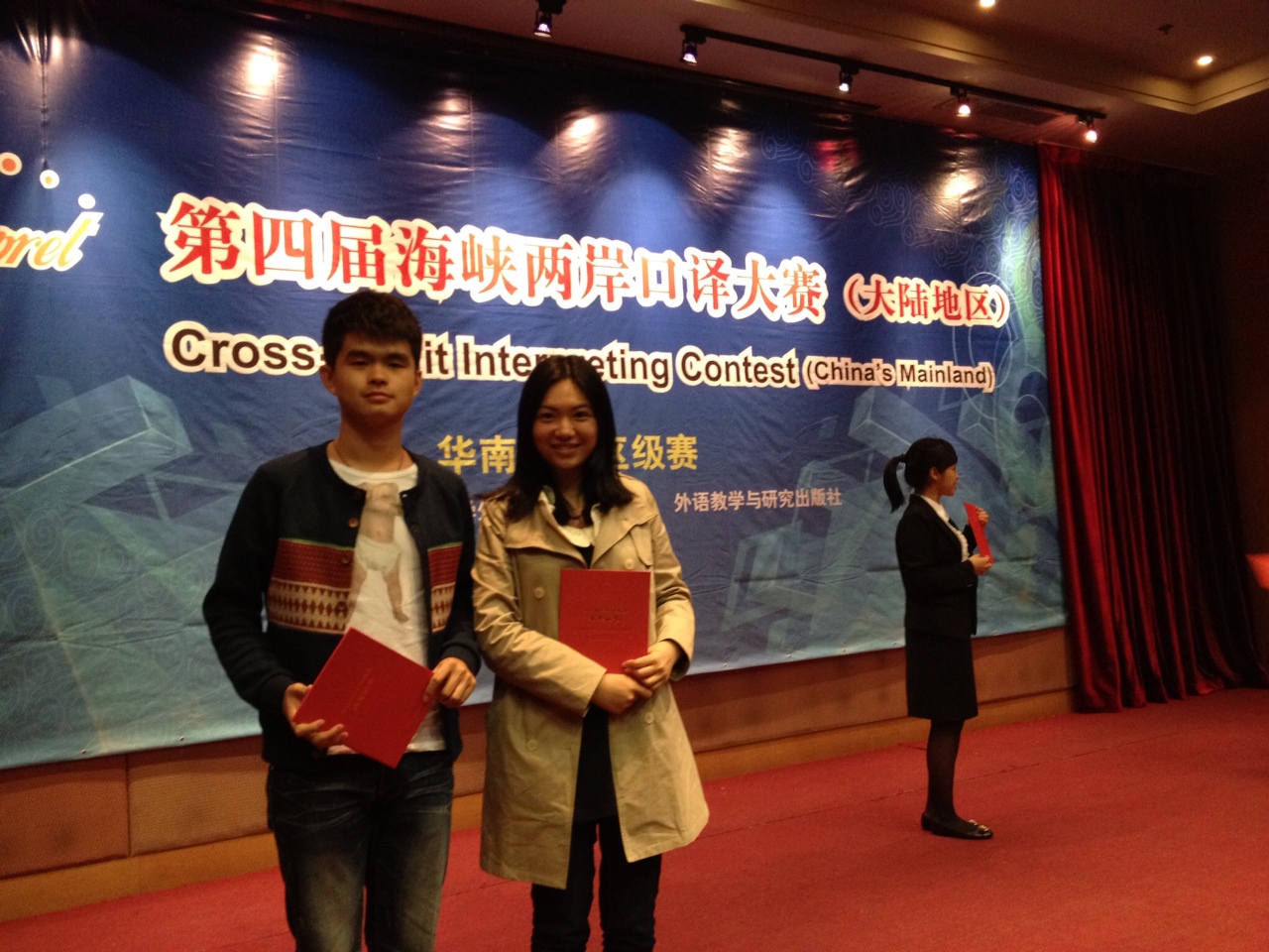 2012年11月24日,第四届海峡两岸口译大赛华南赛区区赛在华南师范大学国际会议厅拉开序幕。华南地区区级赛由华南师范大学外国语言文化学院和外语教学与研究出版社共同主办,共有来自福建、广东、海南、广西四个省市区20所高校的48名选手参加。广东外语外贸大学冯之林教授、华南理工大学刘洊波教授、华南农业大学何高大教授等15位专家担任大赛评委。本次大赛的比赛主题是:健康与生活(Health and life)。比赛分为三个环节:主旨口译、对话口译、会议口译,采用淘汰制逐级选拔。在上午进行的主旨口译环节中,选手们同台竞技,经过激烈的比拼,前12名选手成功晋级下午的对话口译环节。在对话口译环节胜出的前6名选手进入最终的会议口译环节。我校共派出两名同学(2009英语A班丁伟、2009英语C班周然)赴广州参赛,经过激烈角逐,本校两名同学均获得优胜奖(排名前20)。
