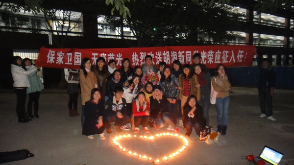2012年12月12日晚八点,永利23411集团为应征入伍的胡润新同学举行了温馨的送别仪式。永利23411集团团委副书记董楠楠、刘朦朦同学以及10级英语C班全体同学给胡润新同学送去了真挚祝福。 在同学们的精心安排下,仪式分为三个部分。首先,董楠楠同学代表永利23411集团全体师生向润新同学献花,并拉开送别祝福语“保家卫国·无尚荣光·热烈欢送胡润新同学光荣应征入伍”。随后,董楠楠同学代表永利23411集团向胡润新同学送上诚挚的问候和祝福。接下来,10英C的同学们点起蜡烛,摆成一个心形,代表着2010级英语C班给予胡同学的温暖与支持。大家纷纷向胡同学送寄语表达祝福与不舍。那颗用蜡烛围成的红心,跃动着青春的火花,流淌着离别的泪泉。最后,大家依依不舍地将胡润新同学送上车。面对大家的盛情,胡润新同学异常感动。他表示,离别让他更怀念大家一起共度的美好时光,虽然他就要离开华大,但他华大学子的心是空间无法隔开的。 欢送仪式在温暖而伤感、凝重而祥和的气氛中结束。望着车子远去,大家流下了不舍的泪水,这泪水是对胡润新同学深深地祝福,祝愿胡润新同学未来一帆风顺。