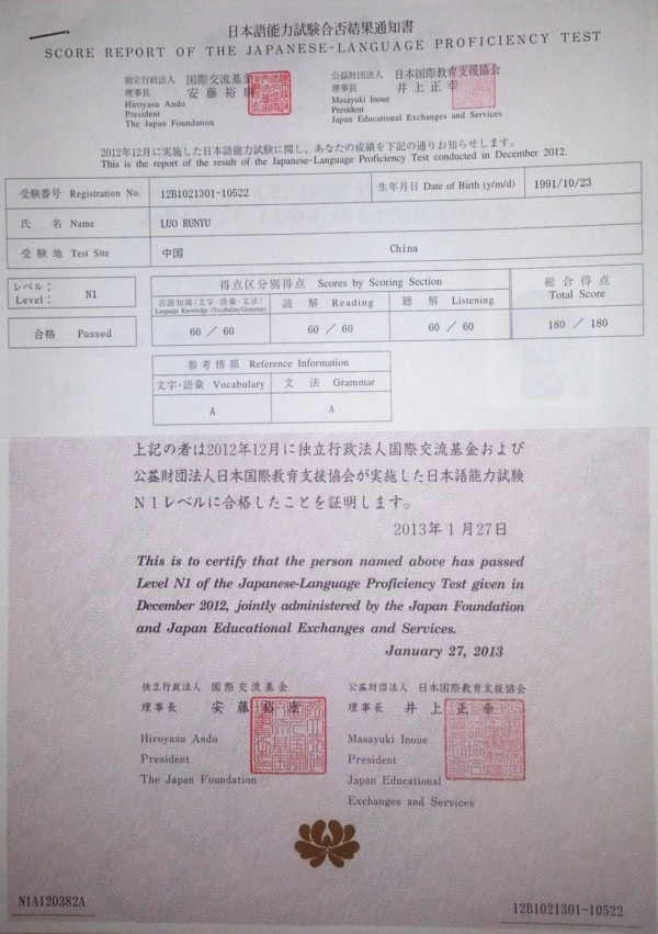 近日,2012年12月举行的国际日语能力考试N1等级(一级)成绩揭晓。我院日语系2010级A班罗润钰同学凭借扎实的专业基础,考出了满分180分的历史性突破成绩。 国际日语能力考试由日本国际交流基金创办,是全球认可的、最具权威的、在世界范围内参考人数最多的日语能力考试。该考试相当于英语的托福考试,分为五个等级,其中N1考试为最高等级考试。 本次N1考试是自2010年题型改革后难度最大的一次,全世界合格率仅为24.1%。罗润钰同学能在如此高难度的考试中获得满分的优异成绩,实属不易。希望她今后能再接再厉,再创佳绩,也希望全院同学能够以罗润钰同学为榜样,刻苦学习,为学院争光。