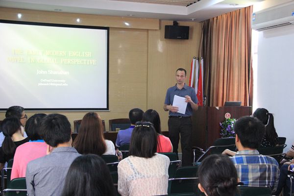 2014年6月27日,美国德保罗大学英语系John Shanahan博士来专程我院讲学。当天上午,John Shanahan博士与我院领导和部分师生座谈,座谈的氛围热烈,内容涉及英美文学研究、学术交流与合作等方面。下午,John Shanahan博士在外语学院大会议室为我院师生做了两场内容丰富的学术报告:1)全球化视野下的早期现代英语小说(The Early English Novel in Global Perspective);2) 文学与批评中新媒体技术的功用(New-Media Tools in Literature and Criticism)。John Shanahan博士收集的文献资料翔实,学术观点新颖独到,对我院师生如何做文学批评有很好的启迪作用。