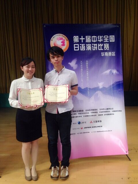 5月24日,由中国教育国际交流协会、日本经济新闻社和日本华人教授会议主办,广东外语外贸大学承办的“第十届中华全国日语演讲比赛(华南赛区)”在广东外语外贸大学隆重举行。 中华全国日语演讲比赛是目前国内日语专业规模最大、影响范围最广的一项赛事。全国共分八大赛区举行。本次华南赛区的比赛竞争异常激烈,共有来自福建、广东、广西、海南、香港的26所高校的26名选手参赛。比赛由命题演讲和即兴演讲两部分组成。设有特等奖2名,一等奖1名,二等奖2名,三等奖3名,优秀奖若干名。 我校选派的日语系3年级李阳子同学,在比赛过程中表现出色,凭借清晰的发音、优美的语调、流利的表达获得了比赛二等奖,日籍教师今悠恭先生获得优秀指导教师奖。