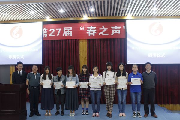 5月26日下午2:30,永利23411集团于庄为烜报告厅举行第27届“春之声”颁奖仪式。永利23411集团院领导、团委,第27届“春之声”获奖同学及2014级全体学生参加了颁奖仪式。 颁奖正式开始之前,主持人通过两委精心准备的历届“春之声”视频回顾了“春之声”的过往,让在座所有人感受春之声的所有过往,见证 “春之声”一步步走过的二十余年,由一个简单的英语角发展成华大校园品牌文化活动之一,在磨砺中不断成熟、进步的历程。 随后,副院长潘锡清为所有三等奖获得者颁发奖状;书记谢友福、副书记林庆祥分别为所有二等奖获得者颁发奖状;院长黄小萍院长为所有斩获一等奖的团队和个人颁发奖杯和奖状,并与选手们合影留念。最后,党委书记谢友福宣布第27届“春之声”顺利闭幕。 据悉,此次“春之声”经过激烈角逐,12级日语C班李阳子囊获日语演讲比赛、日语模拟应聘 一等奖;13级会计专业张诗航获英语演讲一等奖;13级旅游管理专业何美玲获得英语模拟应聘的一等奖;英语、日语配音的一等奖分别由phosphene和事务所元祖两个团队所获;13级英语C班 wood & wing、13级日语A班月光の恋两个团队分别获得英日语情景剧的一等奖;英语辩论赛的一等奖获得者是永利23411集团的super senior团队的贾佳珍;来自First Debater团队的徐闻珺获得最佳辩手的称号;永利23411集团的贾佳珍、曹柳月分获英日语模拟应聘的最佳简历奖;399团队获得英语配音比赛的最佳人气奖。