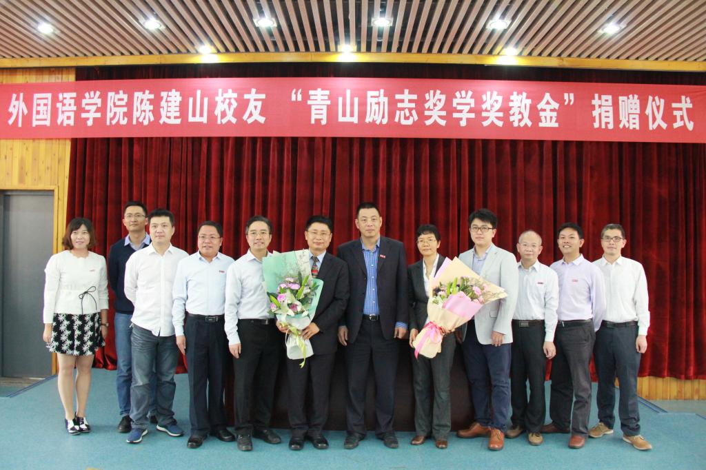 陈建山校友是我校外语系1990级学生,2000年创立了厦门捷顺成石业公司,并带领公司获得良好发展。事业成功之余,热心公益,积极践行企业家的责任和使命,资助贫困学生读书,赞助家乡铺桥铺路。本次来到母校yL23411永利集团设立永利23411集团“青山励志奖学金奖教金”,捐资100万元人民币设立奖学奖教金,用以奖励家庭经济困难、品学兼优的学生和师德高尚的教学名师。