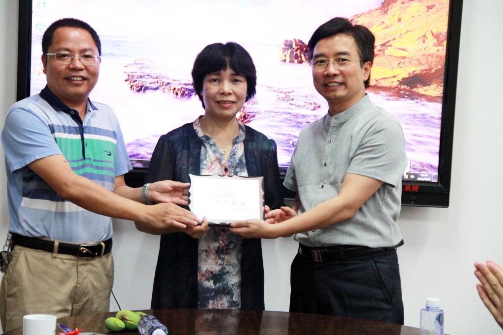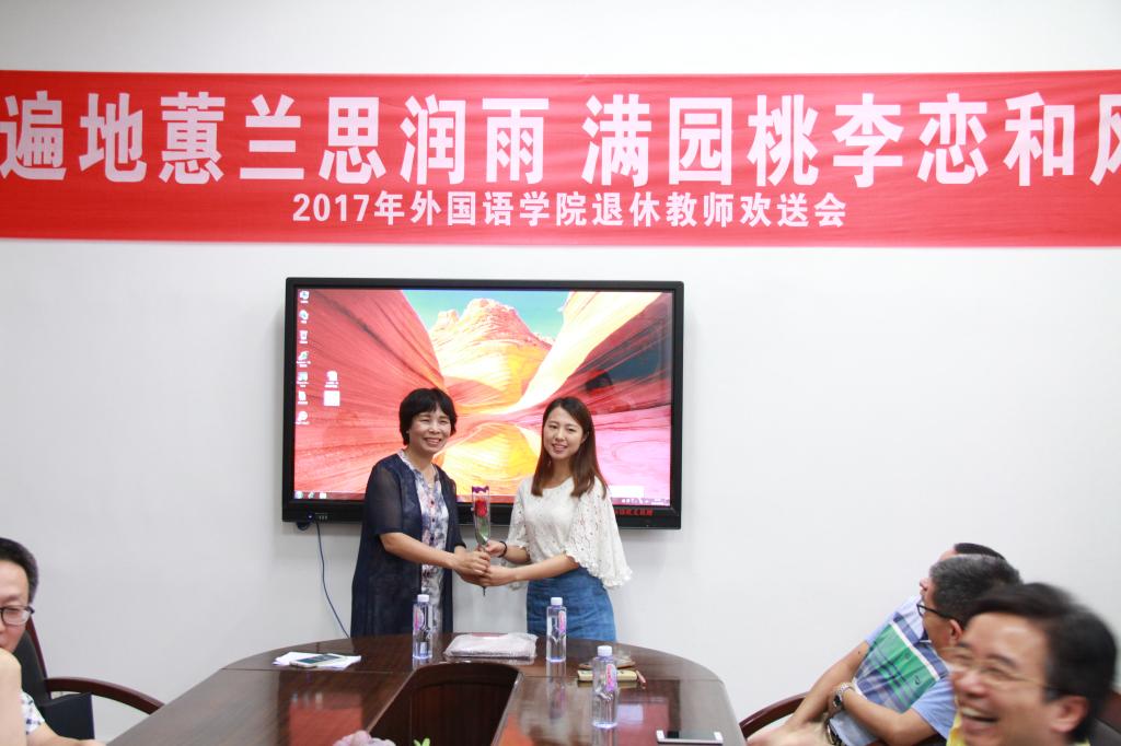 欢送会上,学院领导为光荣退休的黄小萍教授颁发了镌刻着“滋兰九畹,树蕙百亩”的专题纪念匾并合影留念。来自永利23411集团的两名学生代表为黄小萍教授献上了歌曲和鲜花,将欢送会的气氛推上又一个高潮。