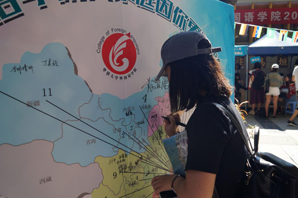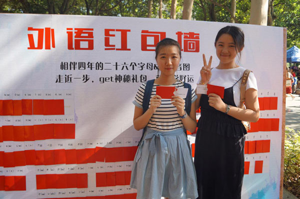 走进外院迎新现场,由日语五十音图和英语二十六字母组成的红包墙吸引了大批新生参与。红包内放有用英语和日语撰写的人生格言卡片、学院领导新学期寄语以及抵用券等,让新生在获得小惊喜的同时感受学院的温暖。以中国地图为背景的签名墙新颖别致,新生纷纷在签名墙上签下自己的名字,象征着正式加入外院这一温暖大家庭。此外,迎新现场还悬挂着万国旗,独具异国风情,彰显外院特色。鼓声正浓,外院的中琉太鼓队鼓点铿锵,太鼓源于日本,被外院学子倾情演绎,独具感染力,吸引了众多家长驻足观赏,成为了华园大道上别具一格的靓丽景致。