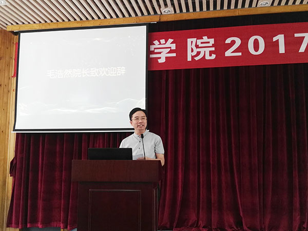 毛浩然院长代表学院对2017级新生加入华大外院大家庭表示热烈的欢迎,在对学院简要介绍之后,他围绕三个M:Muscle, Money, Mind,风趣幽默地诠释了做人与成事的要领。Muscle强调要注重身体健康,他鼓励新生好好珍惜利用学校体育场所,练就强健的体魄,切不可“用健康赌明天”。Money指出要树立独立自强的意识,掌握更多的知识,不断增强自身竞争能力,他希望同学们“有本事自己赚,不要慷父母之慨!不要视父母的血汗钱如粪土,更不要因为自己出身贫寒而自卑”。Mind指的是思维能力,他希望新生们从培养目标定位能力、正确选择能力、批判性思维能力、得体表达能力、耐挫折能力和相处合作能力等方面实现自身的全面发展。最后,他以学院迎新对联“智融古今,多闻阙疑勤读名篇经典;学贯中外,慎思笃行常怀家国天下”与新生共勉,祝同学们早日成为具有三个M的人,并早日找到有Muscle有Money有Mind又让人舒服的另一半。院长亦庄亦谐的演讲赢得了现场的阵阵掌声,为新生的大学生活指明前进的方向。