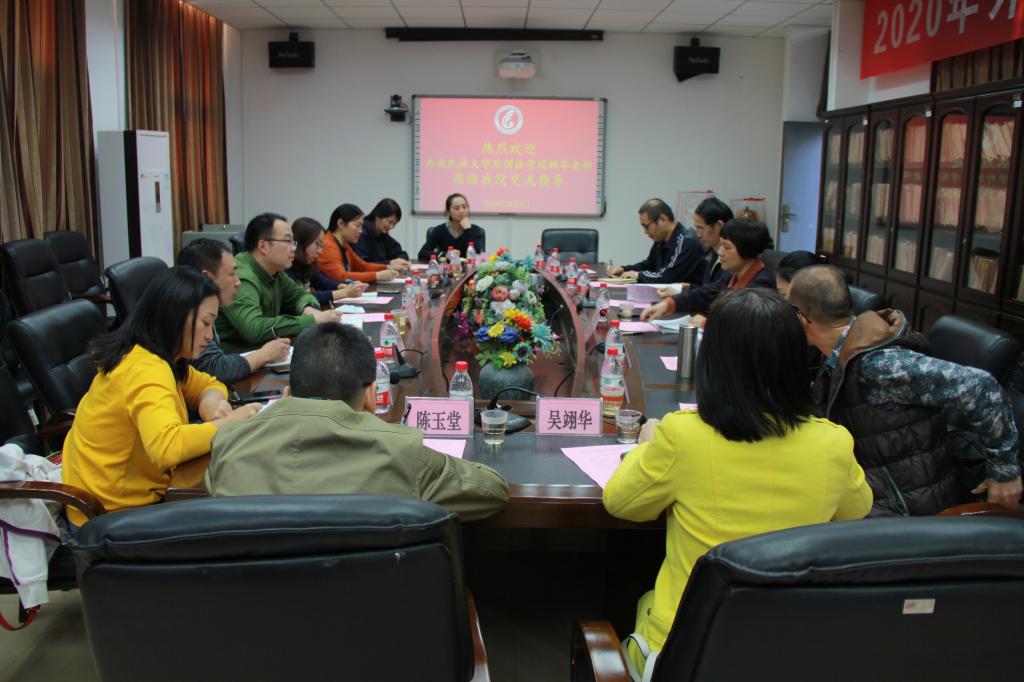 2020年12月3日下午,西南民族大学外国语言文学学院邓忠副院长一行8人莅临我院开展调研交流。调研交流会在学院411会议室举行,学院党政领导、各系部负责人、教研室主任等出席交流会议。