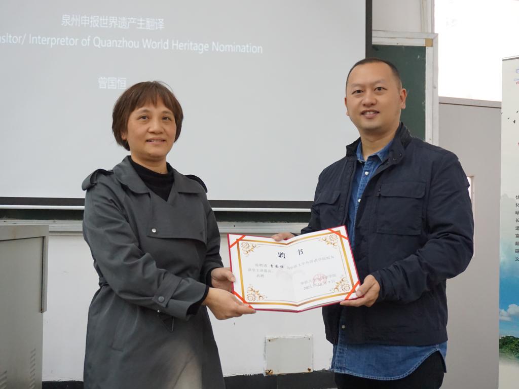据了解,曾国恒校友自2000年以来担任泉州非遗相关传统文化翻译推广工作,并到访多国进行巡演,有着丰富的文化推广和翻译经验。泉州申报世界文化遗产期间担任主翻译,负责申遗国际专家现场考察、相关国际专业会晤、学术会议翻译,并参与申遗文本翻译和审校工作。