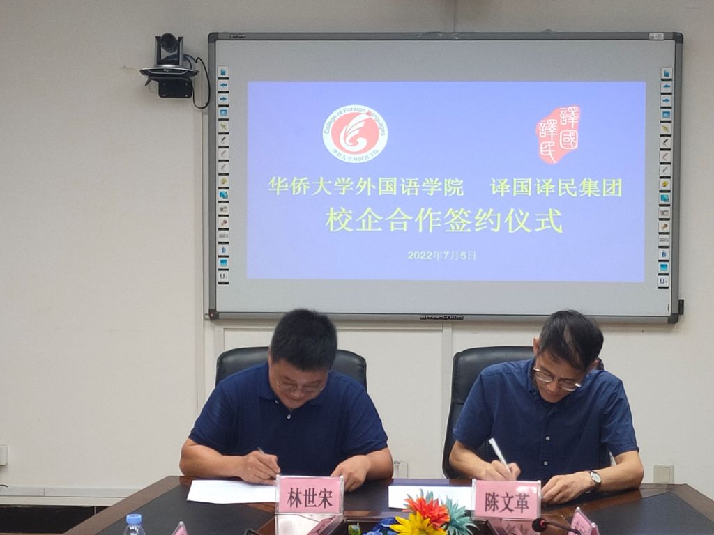 随后,译国译民集团院校合作经理陈建清详细介绍了该集团近年与国内上百所高校开展合作的项目情况。双方随之对校企合作的具体方向和细节进行了深入、细致的交流探讨。会上,举行了实习实践基地合作签约仪式,林董事长、陈副院长代表双方在合作协议上签字。