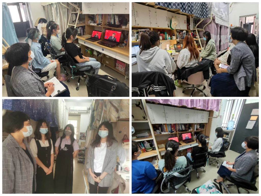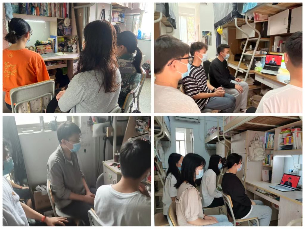 学院团委书记、党委委员、辅导员、研究生秘书等老师分别走进不同楼栋宿舍,与同学们一起观看交流。