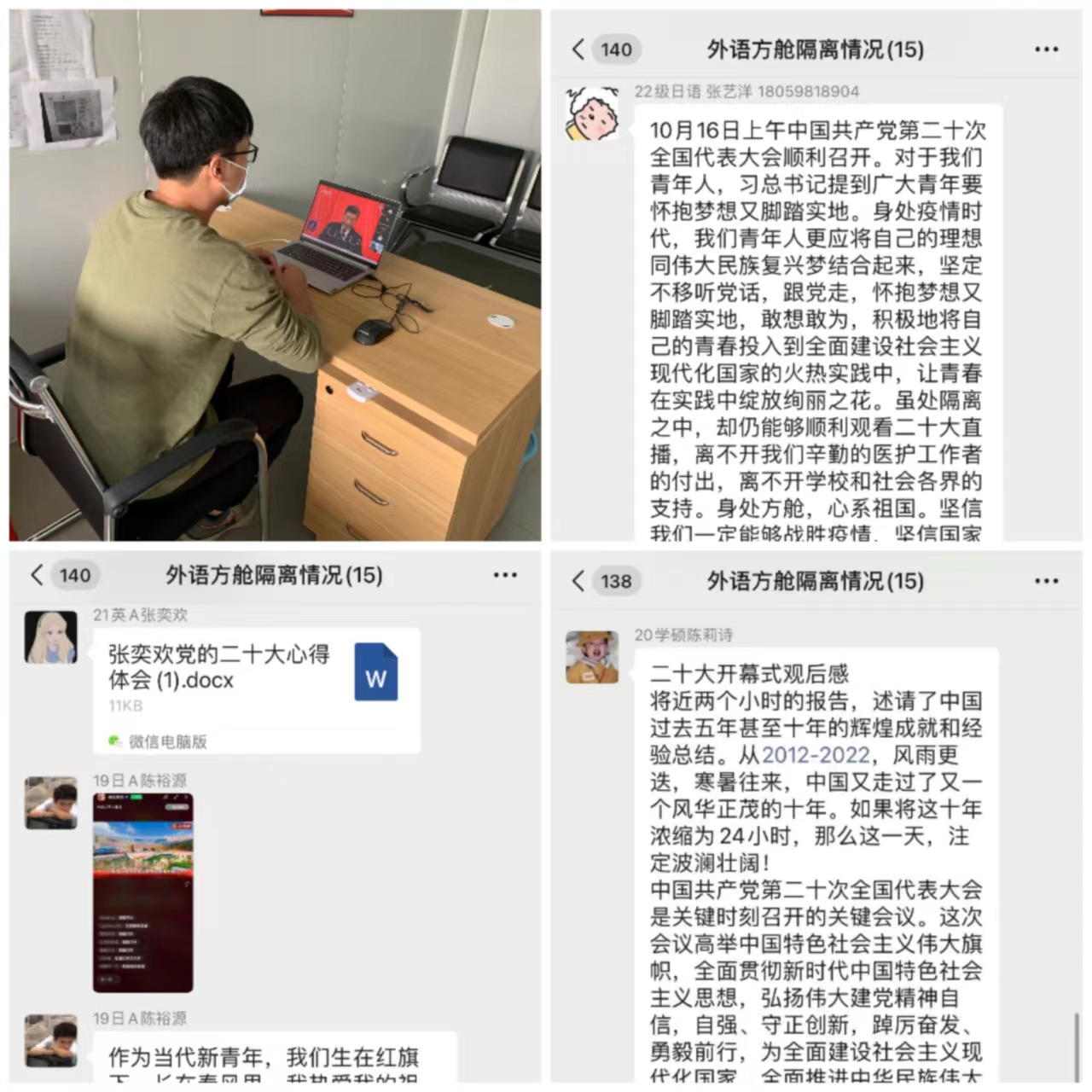 辅导员 卢宝军(方舱医院)观看心得:全程观看本次大会,感触非常多!我们党和全国各族人民取得了非常伟大的成就,也同时对我们未来发展提出了新的要求。其中总书记报告中提到与我们相关的科教兴国战略,要求我们站在这个新时代新起点,要对自己有新要求,要肩负起我们新青年的使命,发挥好我们新青年的作用,团结带领我们党和全国各族人民奋进新征程!方舱隔离的19级日语专业陈裕源同学说,作为当代新青年,身为人民群众中普通的一员,我将时刻为理想而努力,并以行动证明自己的决心。