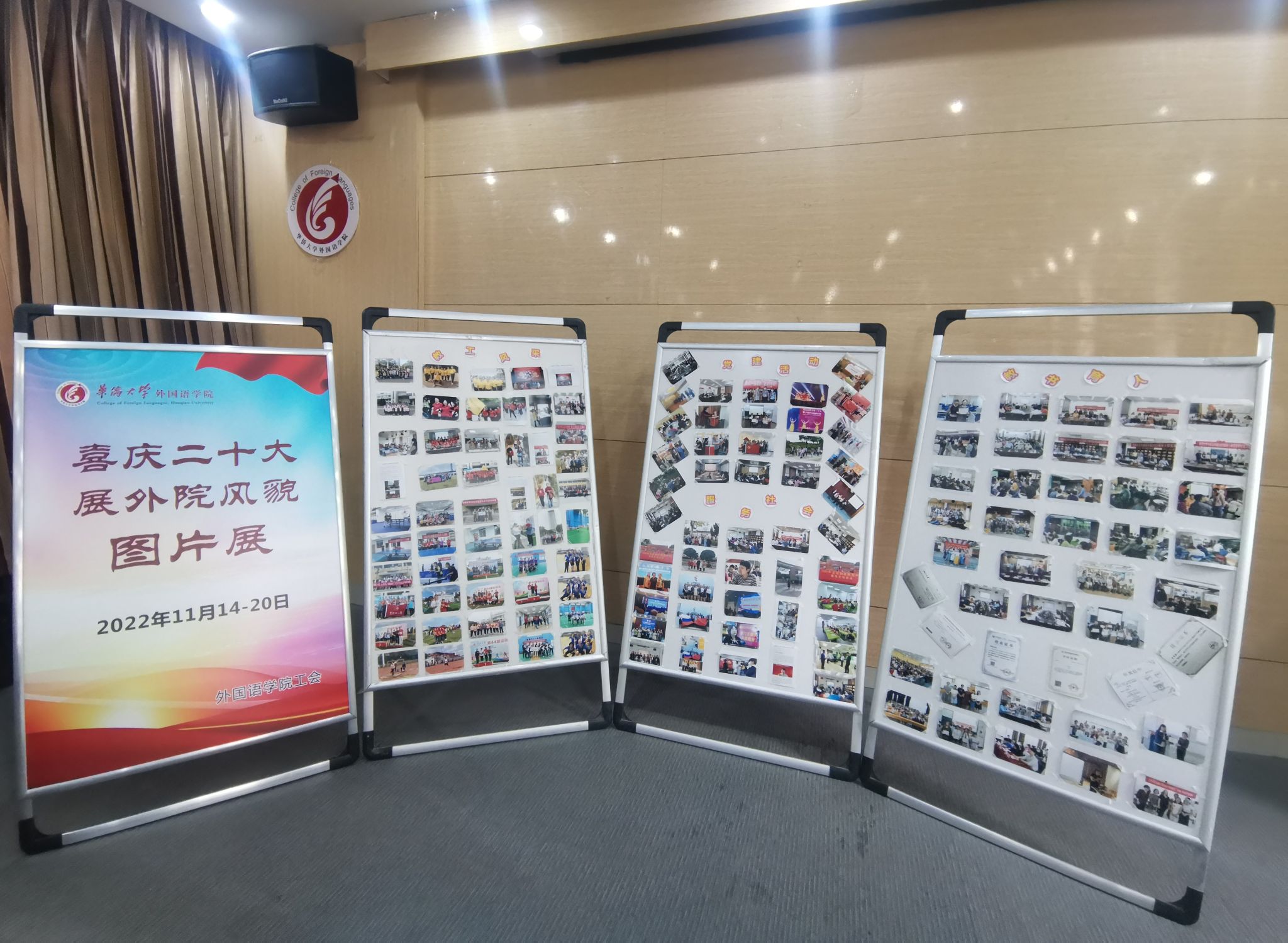 在教职工们的积极参与下,工会于2022年11月14-20日期间举办了“喜庆二十大,展外院风貌”图片展,图片展分为:党建活动、教书育人、教工风采、服务社会几个版块。