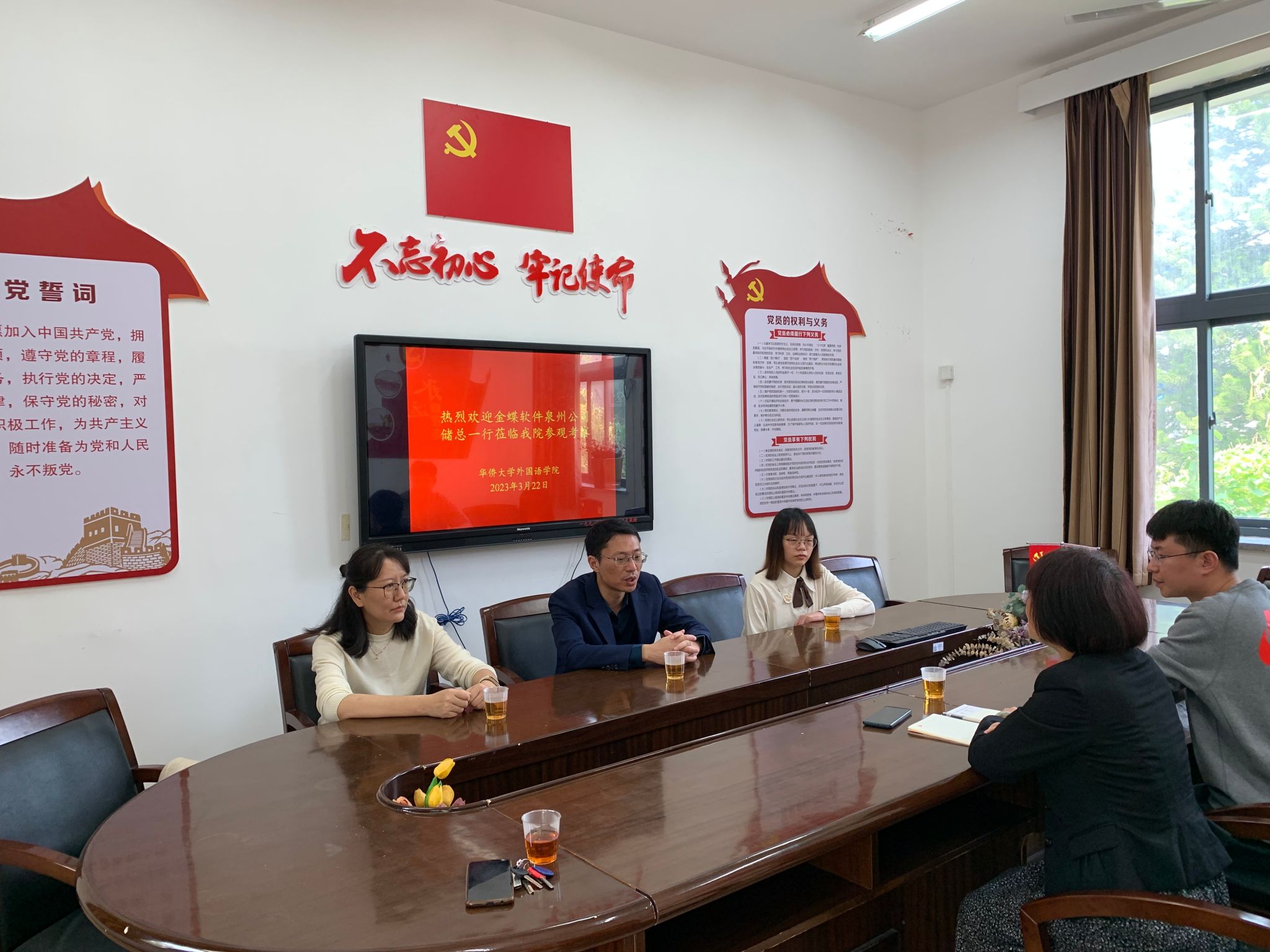 为促进毕业生充分就业,学院进一步落实教育部“访企拓岗专项行动”,3月22日,金蝶软件(中国)有限公司泉州分公司到我院交流走访,永利23411集团党委书记李璐岚、外语系主任吴国向和团委书记李守超接待相关走访人员,就拓宽学生就业实习岗位、进一步加强校企联系、推动产学研结合等问题与企业负责人进行交流座谈。