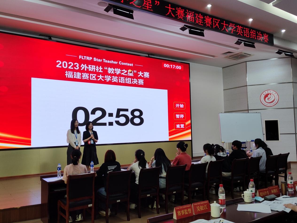 外研社“教学之星”大赛被列入中国高等教育学会“高校竞赛评估与管理体系研究”《全国普通高校教师教学竞赛分析报告》数据来源。本次福建赛区决赛由福建省大学外语教学研究会、外语教学与研究出版社主办,以“外语教材的有效使用:数字赋能,创新育人”为主题,深挖外语教材内涵,打造数字赋能+实践教学新模式,落实外语课程创新育人目标,并以此为契机推动协作共建,培养优秀大学英语教学团队。经过专家评委的初选评审,全省共有7支高校教学参赛团队进入决赛。各决赛团队在20分钟内完成教学设计介绍、课堂教学展示、现场问答等3个比赛环节。