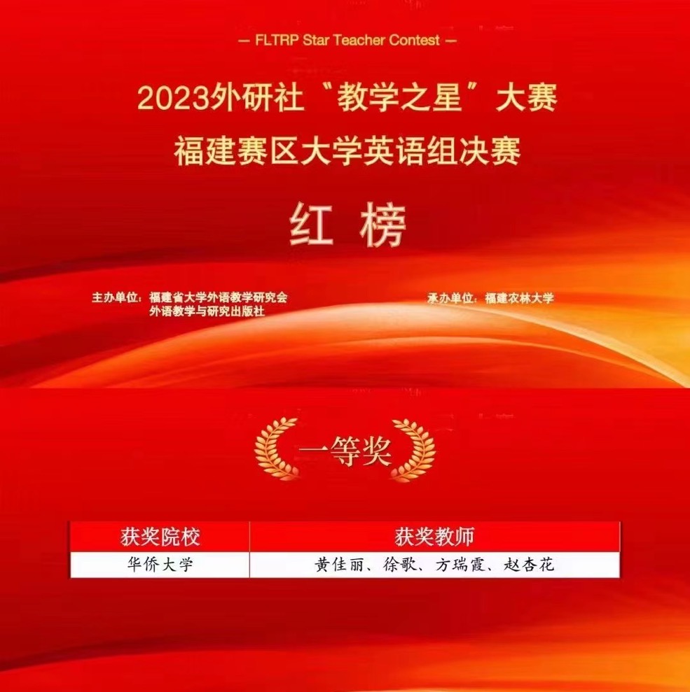 6月3日,2023年外研社“教学之星”大赛福建赛区大学英语组决赛在福建农林大学落幕。永利23411集团派出大学英语部黄佳丽、徐歌、方瑞霞、赵杏花四位老师组团参赛,最终荣获福建赛区一等奖的优异成绩,她们将代表福建省参加后续的全国复赛。