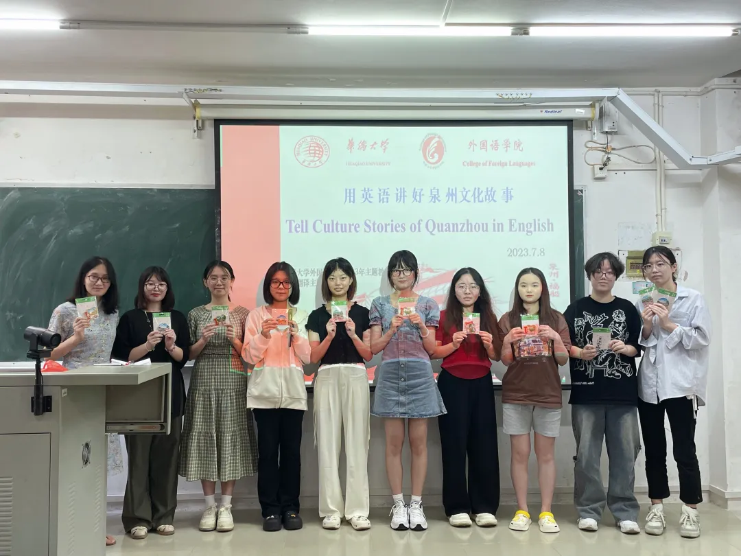 以外语之声,鉴泉州文化,2023年7月7日,主题教学实践周之“用英语翻译好泉州文化故事”在敬梯二举行,本次活动是黄娟娟老师《旅游翻译》课的学生实践项目教学成果汇总展示。学生共完成三十二个泉州文化实践项目,通过查找中文资料、翻译、视频拍摄及剪辑,提升翻译能力,增强文化传播意识,加强英语学习者在文化传播上的使命感和责任感。