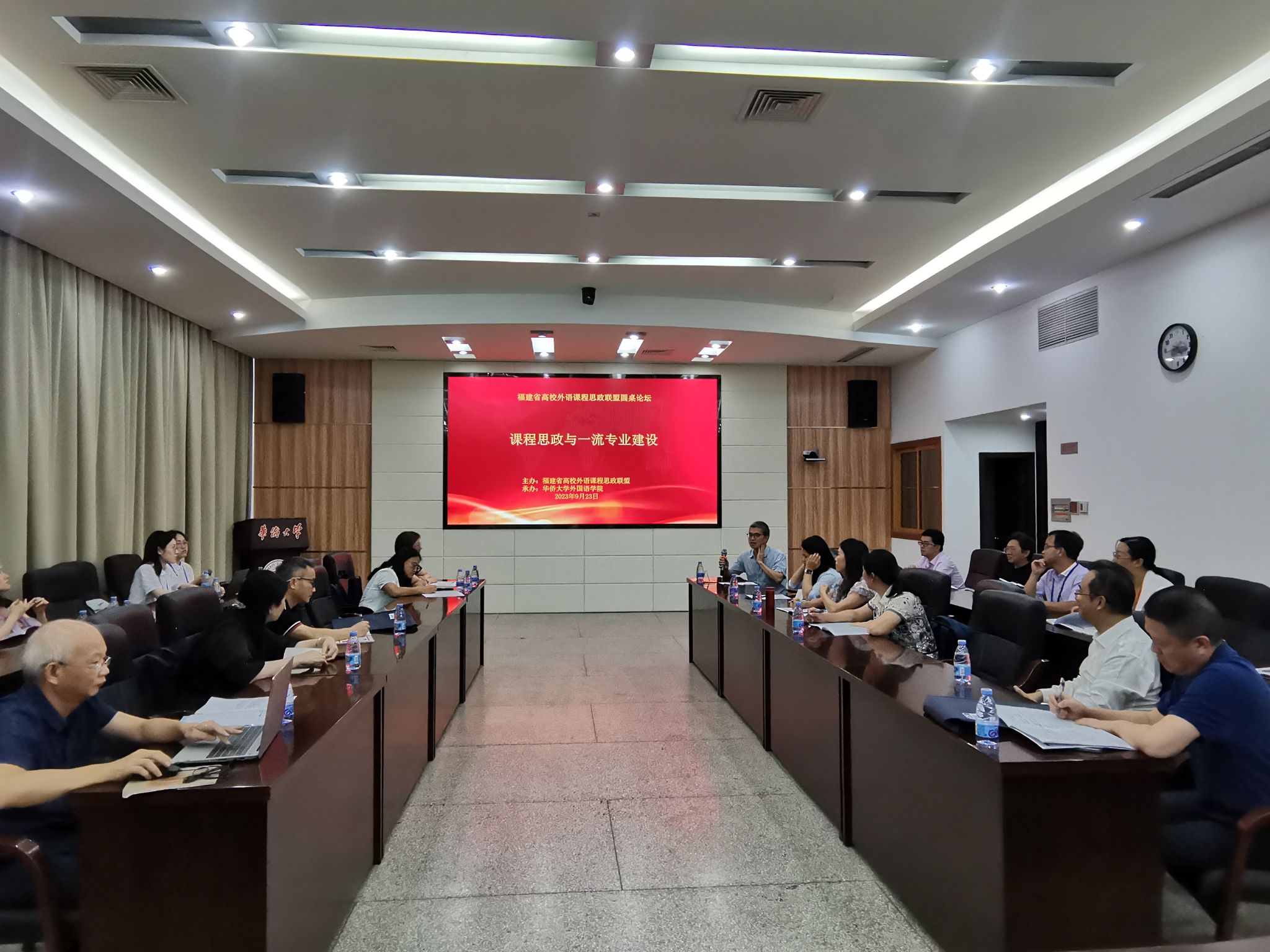 福建省高校外语课程思政联盟9月23日上午正式宣布成立,主旨发言之后的圆桌论坛第一分会场,由永利23411集团国家一流本科专业建设点(英语)负责人、英语系杜志卿教授主持,20余位兄弟院校永利23411集团院领导、老师参与讨论,并就其院校一流专业建设点的现状及课程思政的落实情况进行深入交流。