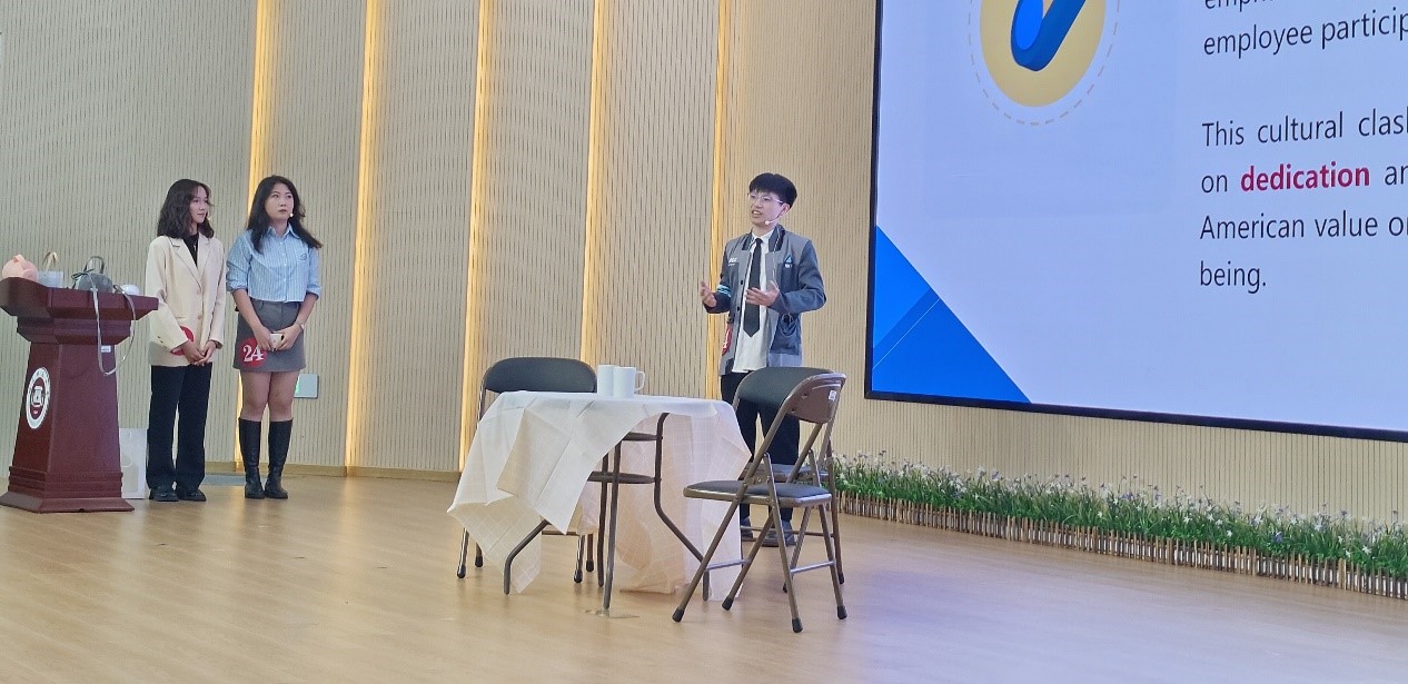 三位来自不同学院的选手(工商管理学院:任子勋、吴成越,永利23411集团:李心妍)组成了“动物派队”(指导老师兼领队:蔡和存,指导老师:林婷婷,负责人:石宝鹏)参加了本次比赛,队员们在激烈角逐中展现了强大的综合素质和团队协作能力。他们不仅在案例开发和案例展析等环节表现出色,将AI技术的应用与跨文化场景紧密融合在一起,还在专家提问环节中沉着冷静、应对自如,给评委留下了深刻印象。这些年轻的学子们在跨文化意识、情感态度、基本理论、交际能力、创新能力等方面都展现出极高的水平。