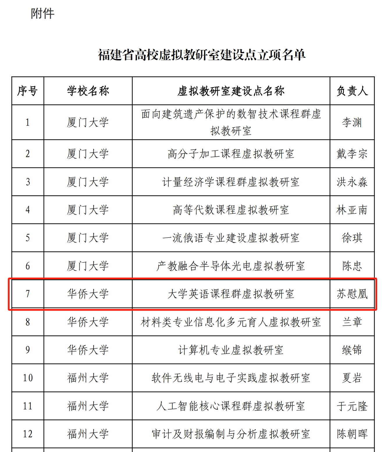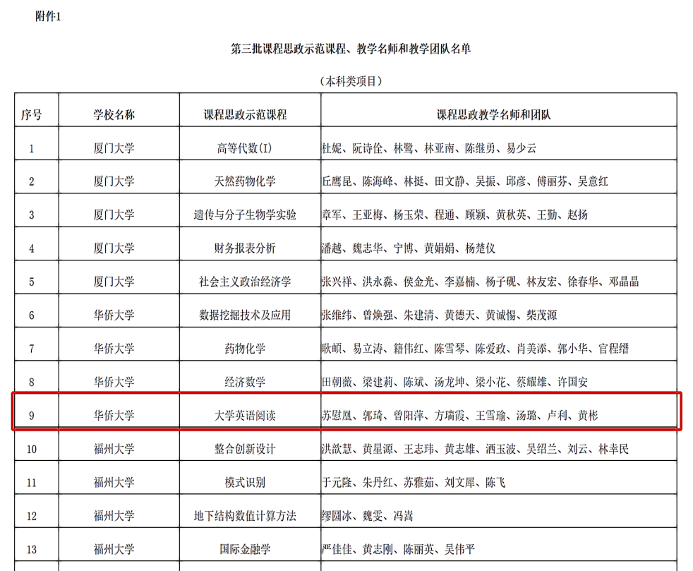 近日,福建省教育厅发布了《福建省教育厅关于公布高校虑拟教研室建设点名单的通知》(闽教高〔2023〕24号)及《福建省教育厅关于公布第三批课程思政示范项目(普通高等教育类)名单的通知》(闽教高〔2023〕25号),我院《大学英语阅读》获批福建省首批虚拟教研室建设点并入选福建省课程思政示范课程。