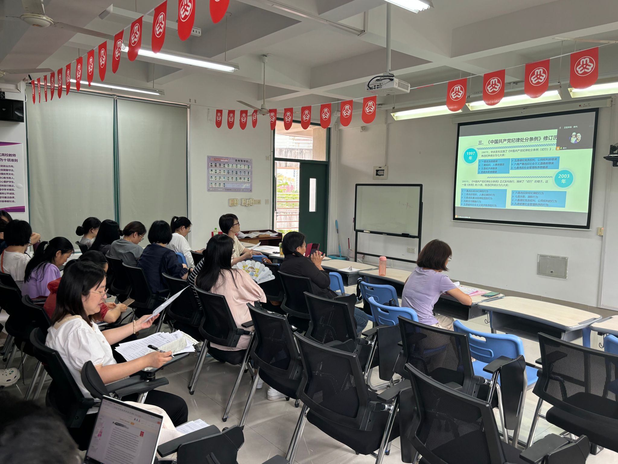 党课从深刻认识修订《中国共产党纪律处分条例》(以下简称《条例》)的重要意义、准确把握《条例》修订的过程、新修订《条例》的主要概况等3个层面进行深入浅出地分析,带领大家回顾了中国共产党在不同历史时期对于党纪的具体要求,阐明了纪律严明不仅是马克思主义政党的本质属性,是党的光荣传统和独特优势,同时也是党应对风险挑战的迫切要求。李璐岚强调,要认真学习新修订的《条例》,牢牢把握政治纪律这一最重要、最根本、最关键的纪律,以此带动组织纪律、廉洁纪律、群众纪律、工作纪律、生活纪律全面从严,全体教师党员要对新修订《条例》深入学习提高认识,牢固树立党章党规党纪意识,《条例》学习不仅要落实在笔记上,还要实践在行动中,根植于内心党性修养,推动学院全面从严治党走深走实。