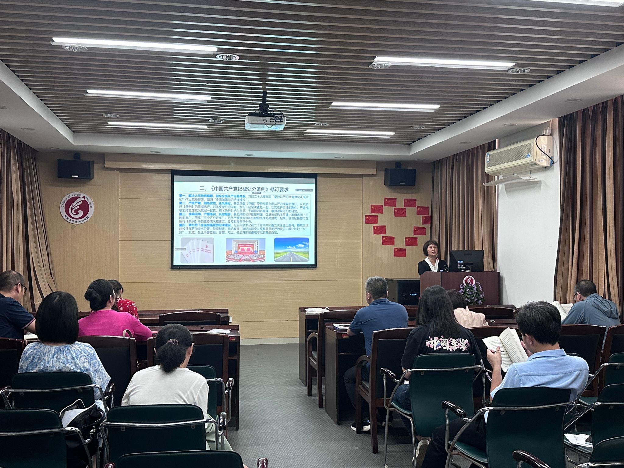 会议要求全体党员教师,一要严格坚守党的政治纪律,以新修订的《条例》为高压红线,做到明底线,知敬畏,不碰线,扎实做好本职工作。二要深刻领会《条例》修订的精神实质,把学习《条例》与“外语+党建”工作结合起来,自觉提高拒腐防变能力,践行共产党人“忠诚、干净、担当”要求,牢记立德树人宗旨,不断增强自我净化、自我完善、自我革新、自我提高能力。