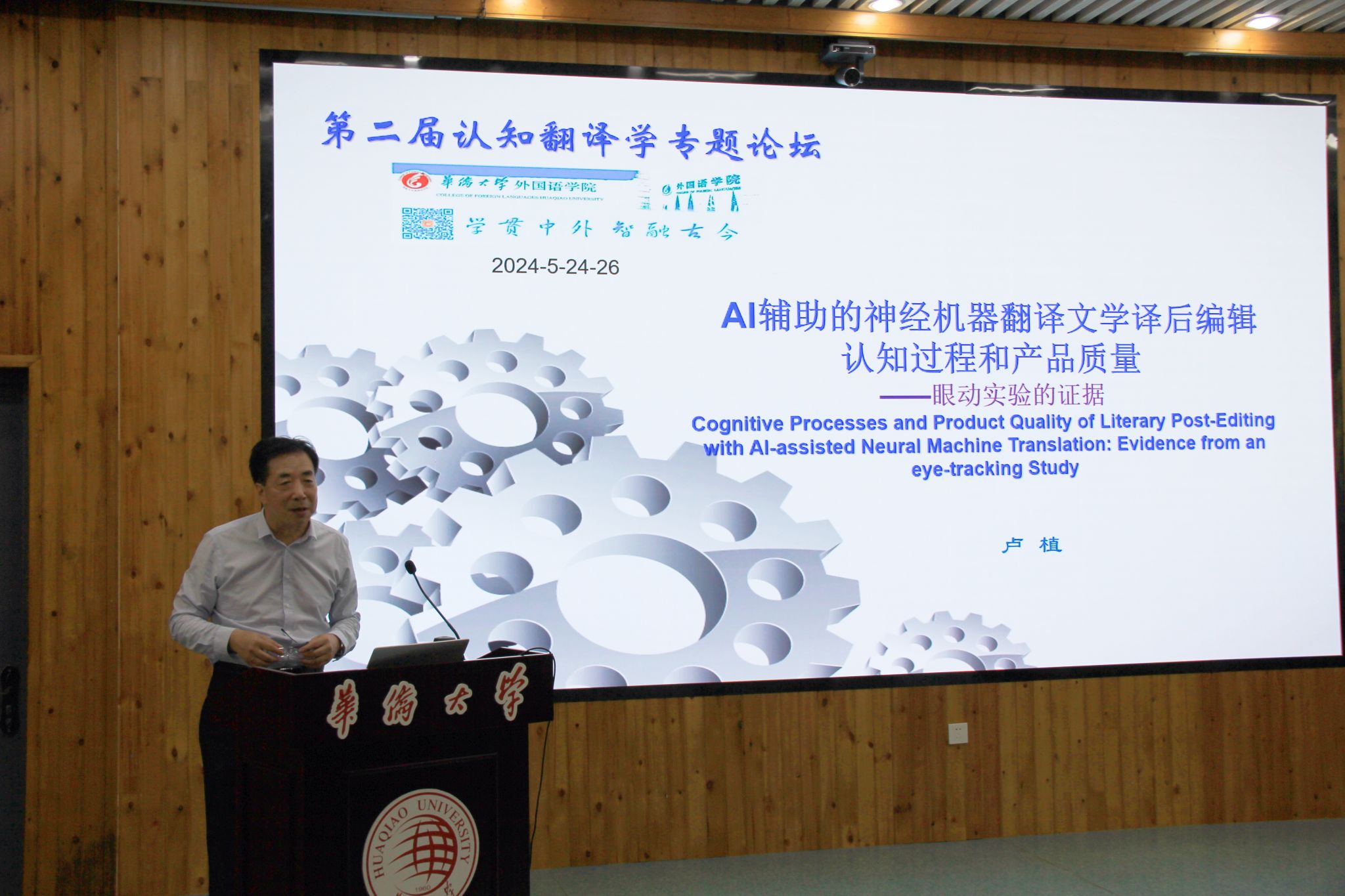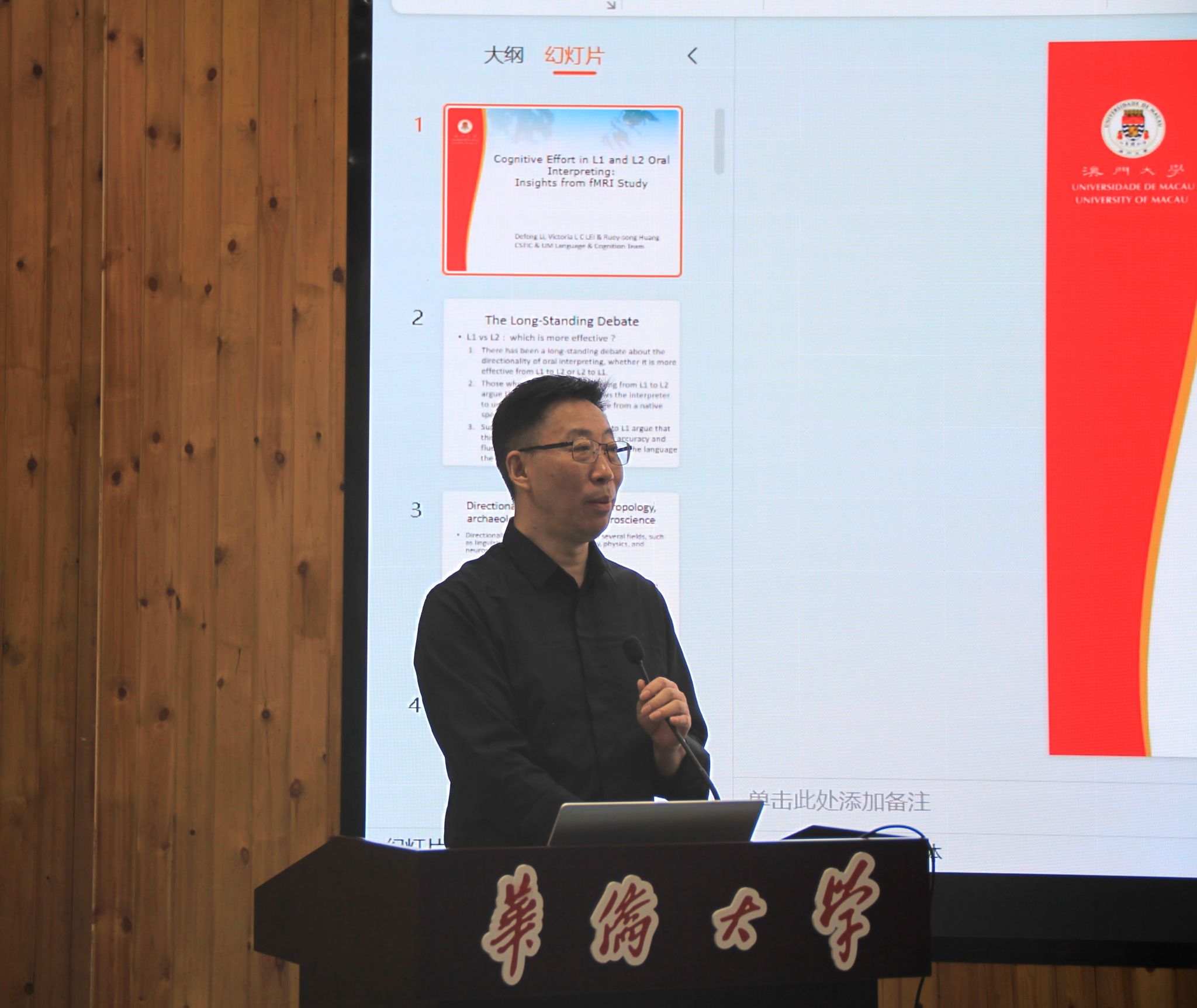 5月25日上午,第一场和第二场主旨报告由华南农业大学李占喜教授主持。澳门大学李德凤教授的报告题目是 “Cognitive Effort in L1 and L2 Oral Interpreting: Insights from fMRI Study”。 李教授围绕翻译的方向性问题,结合脑影像的最新发现,分析了从母语到第二语言口译的认知努力程度的不同。yL23411永利集团特聘教授卢植的报告题目是“AI辅助机译文学译后编辑认知过程和产品质量”。他指出人工翻译在词汇层面,比 AI 译后编辑采用了更为多样的词汇解决方案;在句子层面,译后编辑比人工翻译拆译更多、合译更少,与机译输出的拆译频率接近。