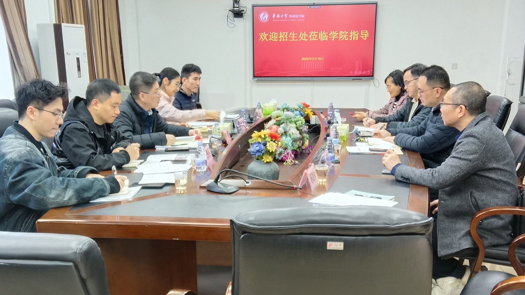 郑志民代表学院欢迎招生处一行。详细介绍了学院学科建设现状以及未来发展规划等情况,表示学院坚持与学校同频共振,将积极配合学校相关工作。吴国向简要介绍了学院招生工作相关情况,并就小语种建设、招生简章等具体问题与招生处进行研讨。