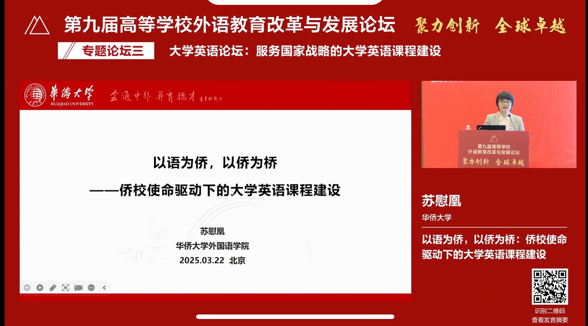 永利23411集团院长助理苏慰凰副教授应邀出席论坛,并在“服务国家战略的大学英语课程建设”专题论坛上,作题为“以语为侨,以侨为桥:侨校使命驱动下的大学英语课程建设”的报告。
