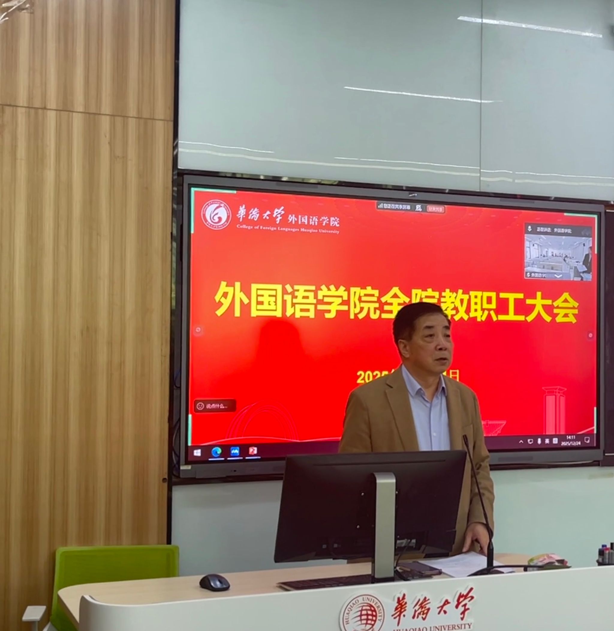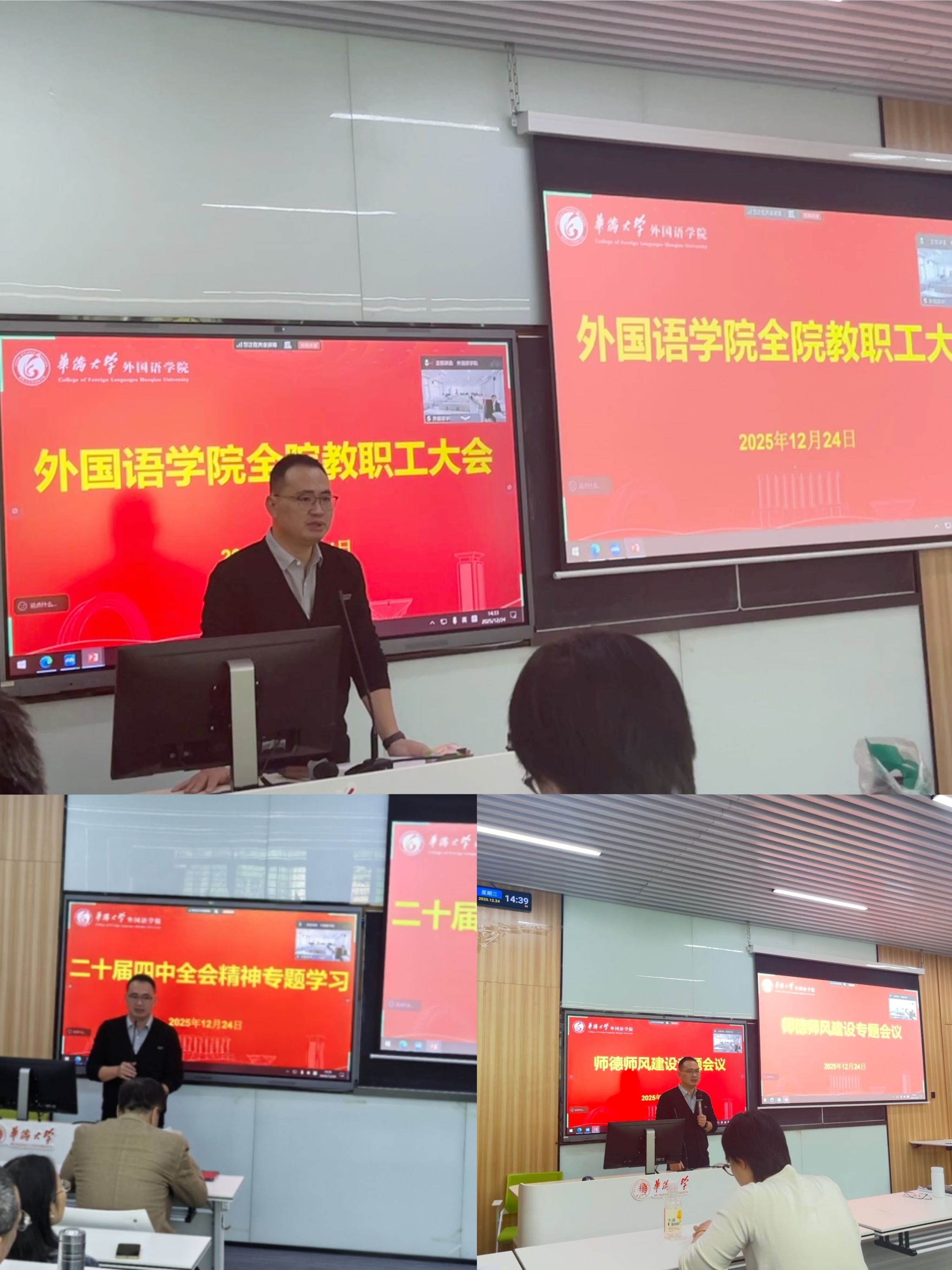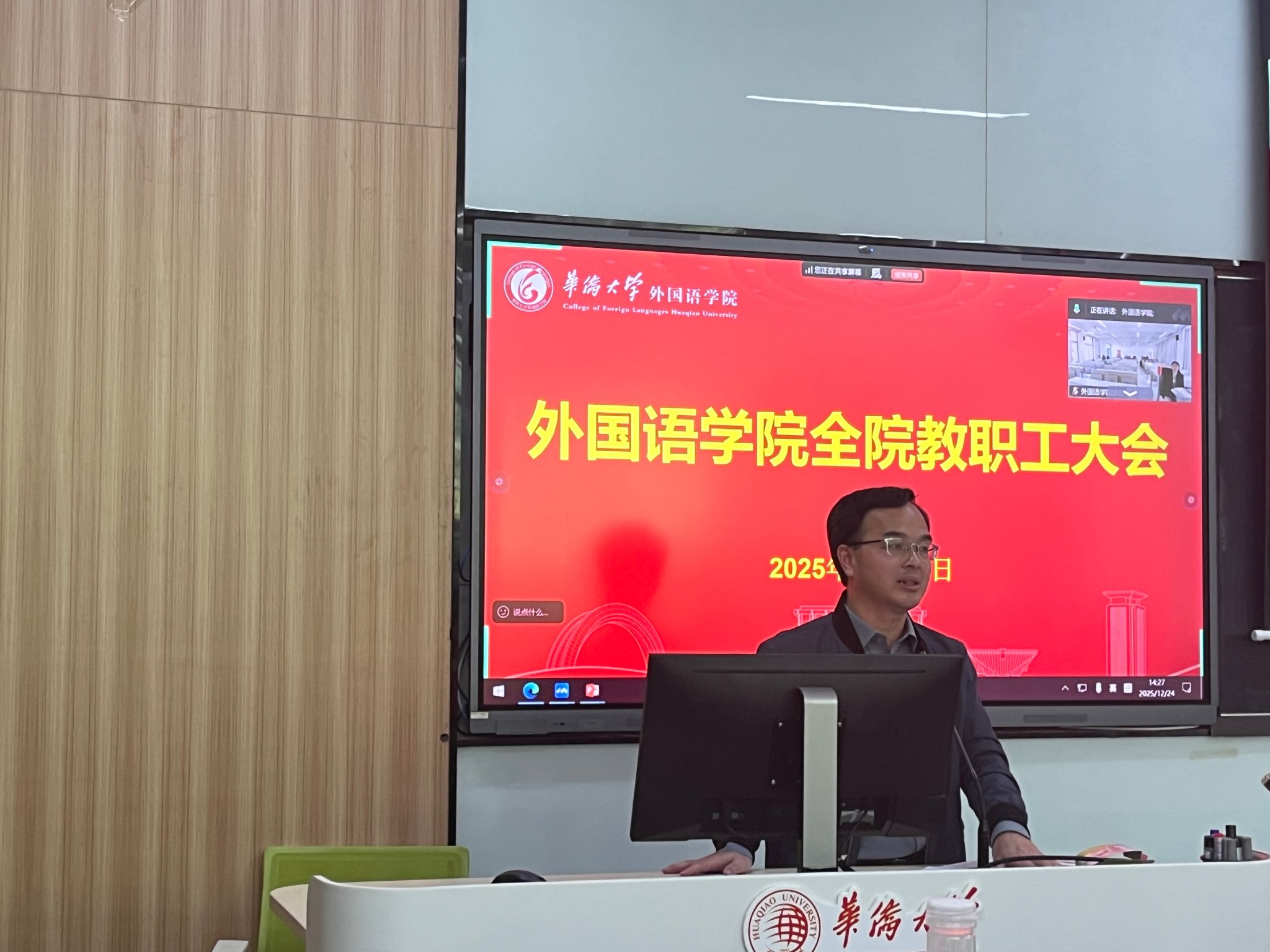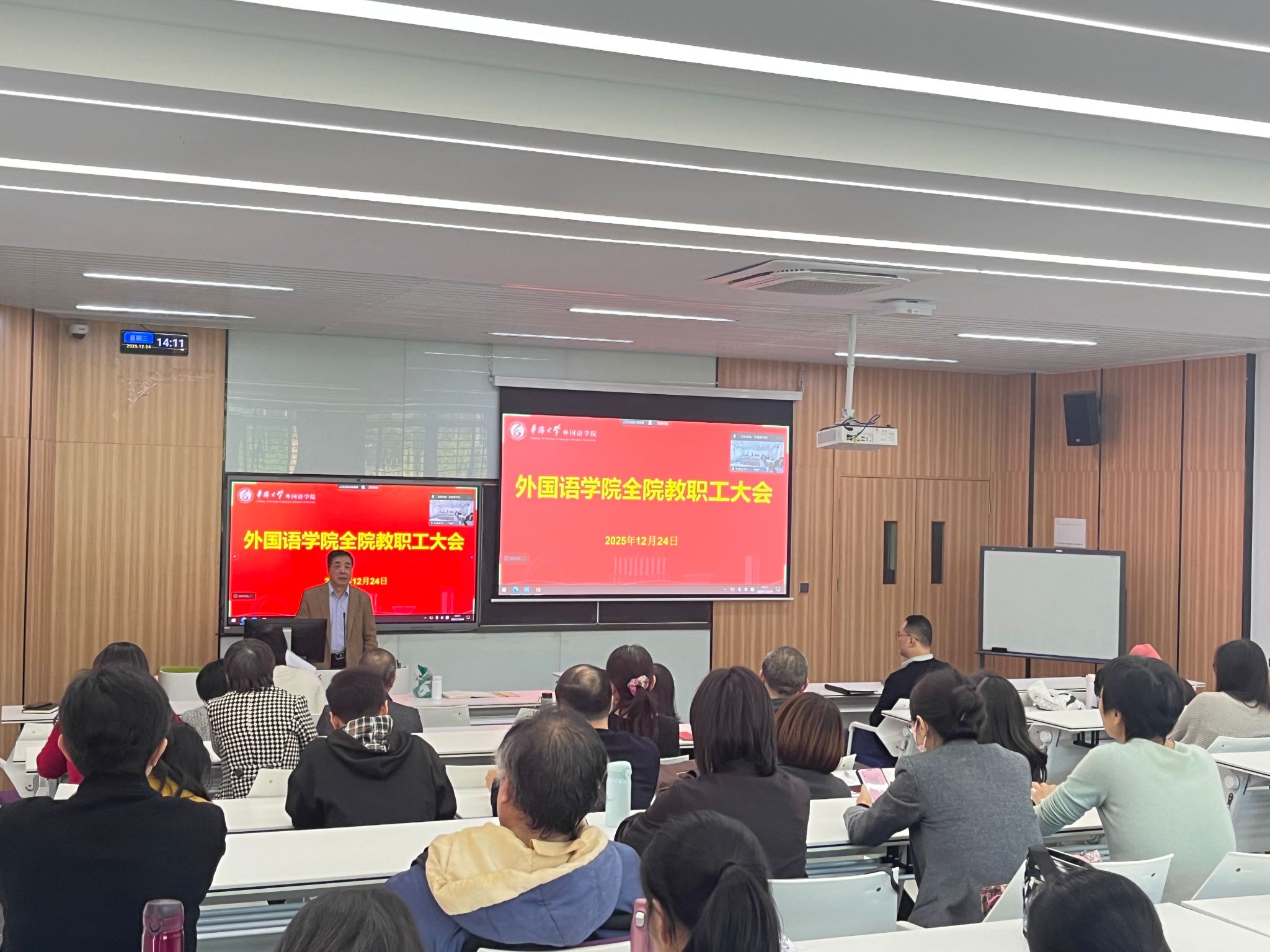 会上,院长卢植围绕学院近期重点任务进行了全面部署和动员:一是动员并鼓励符合政策的教师充分利用假期,提前精心准备,积极申报2026年度国家社科基金项目和教育部人文社会科学研究项目,力争在高级别项目立项上取得新突破。二是针对拟于第三学期初召开的第二届学院教学科研大会,号召全体教师认真总结成果,积极参与交流,共同谋划学院教学科研高质量发展路径。三是通报外国语言文学一级学科博士点建设的当前进展、面临挑战,并简要介绍下一年度的核心建设计划,强调此项工作对学院长远发展的重要意义。四是通报学院已确定在2026年承办的几项全国性重要学术研讨会,要求相关团队早启动、细致筹备,确保会议圆满成功,进一步提升学院学术影响力。五是就进一步提升师资队伍建设水平分享了初步设想,内容涉及优化引育机制、加强团队建设、支持教师专业发展等方面。